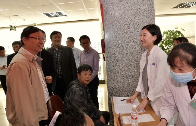 在云龙县人民医院,我校附属东方医院院长刘中民正在组织东方医院部分医生在这里举办义诊,方守恩看望了参与义诊的医生,向他们表示慰问和感谢。