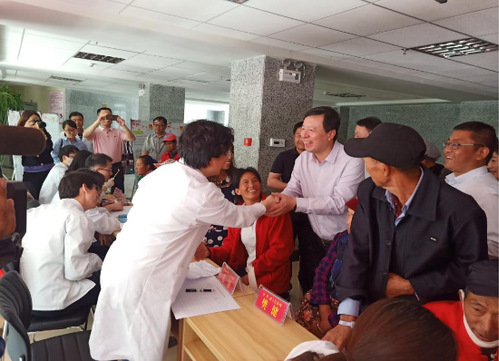 在云龙县人民医院,同济大学附属同济医院、口腔医院、肺科医院正在联合举办“同济·云龙医疗周”活动,为当地百姓义诊,并开展医生培训和手术示范等工作。陈杰一行慰问了医疗团成员,并与当地就诊群众交流,了解实际需求和存在困难。